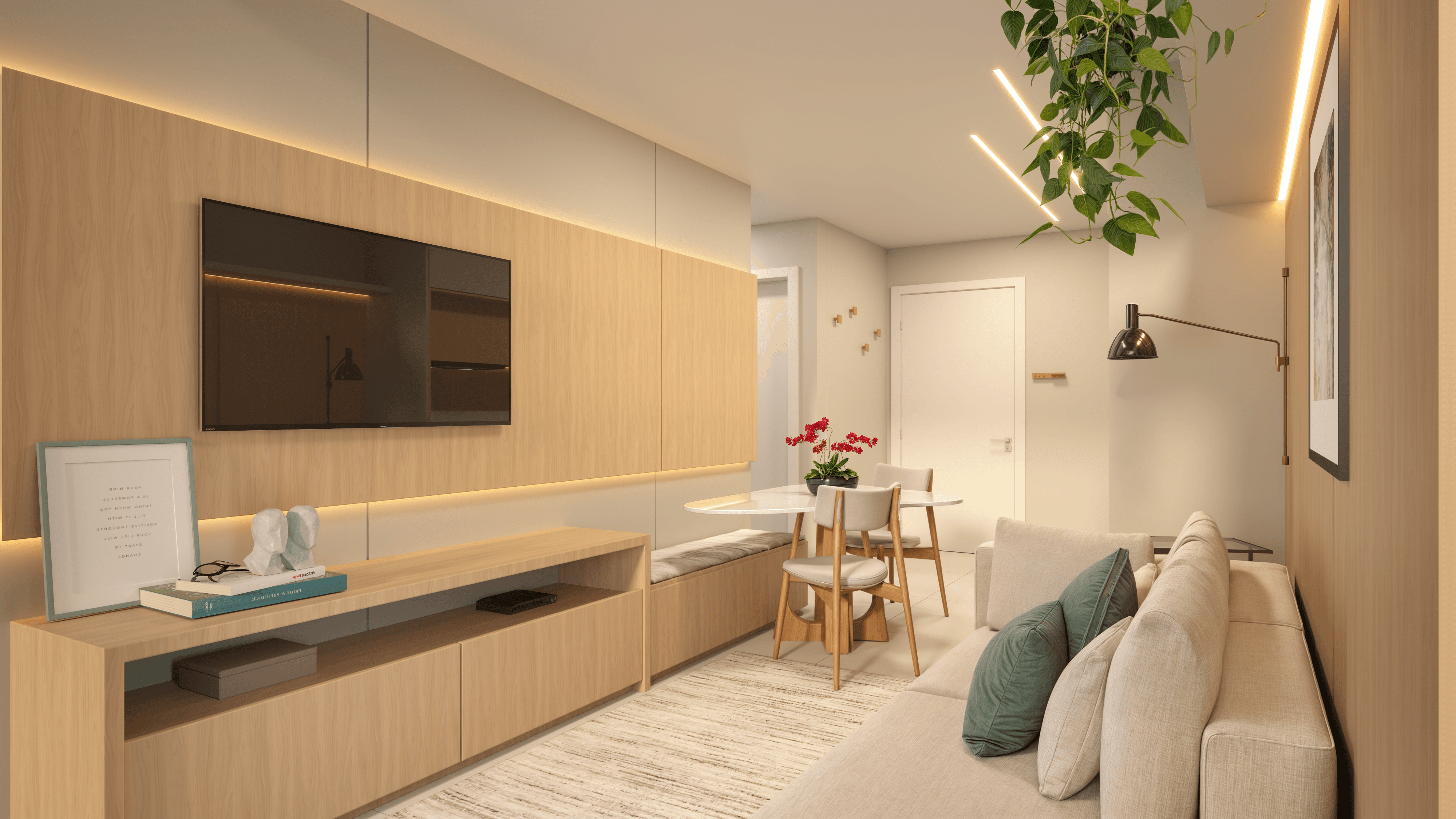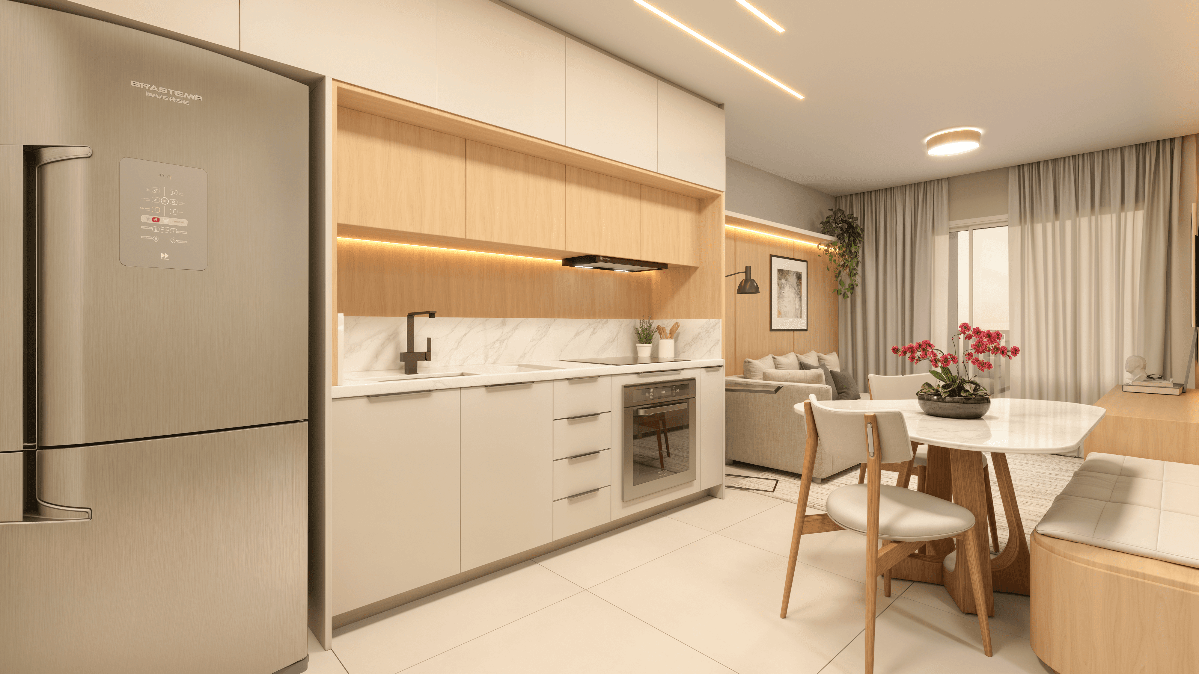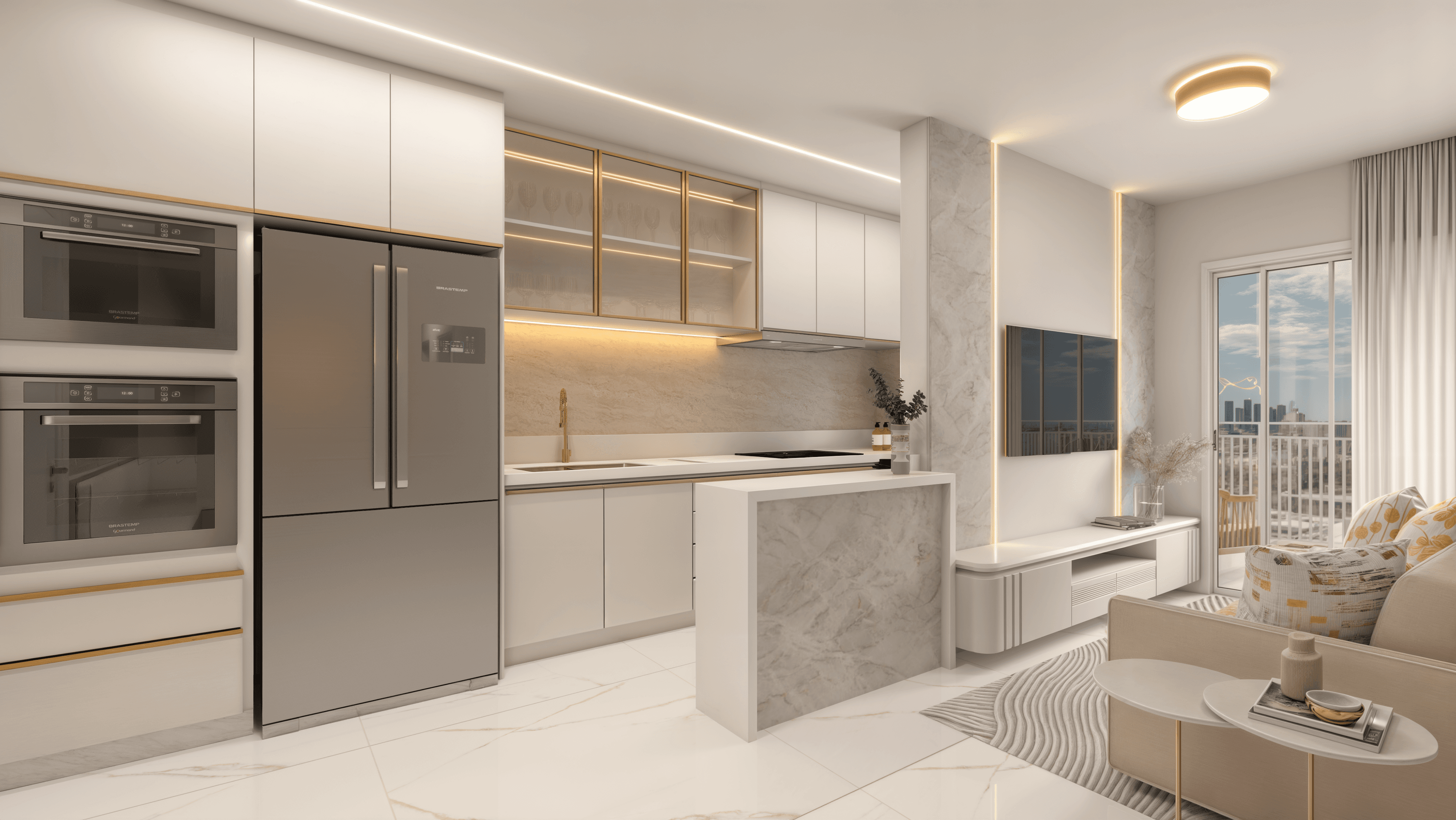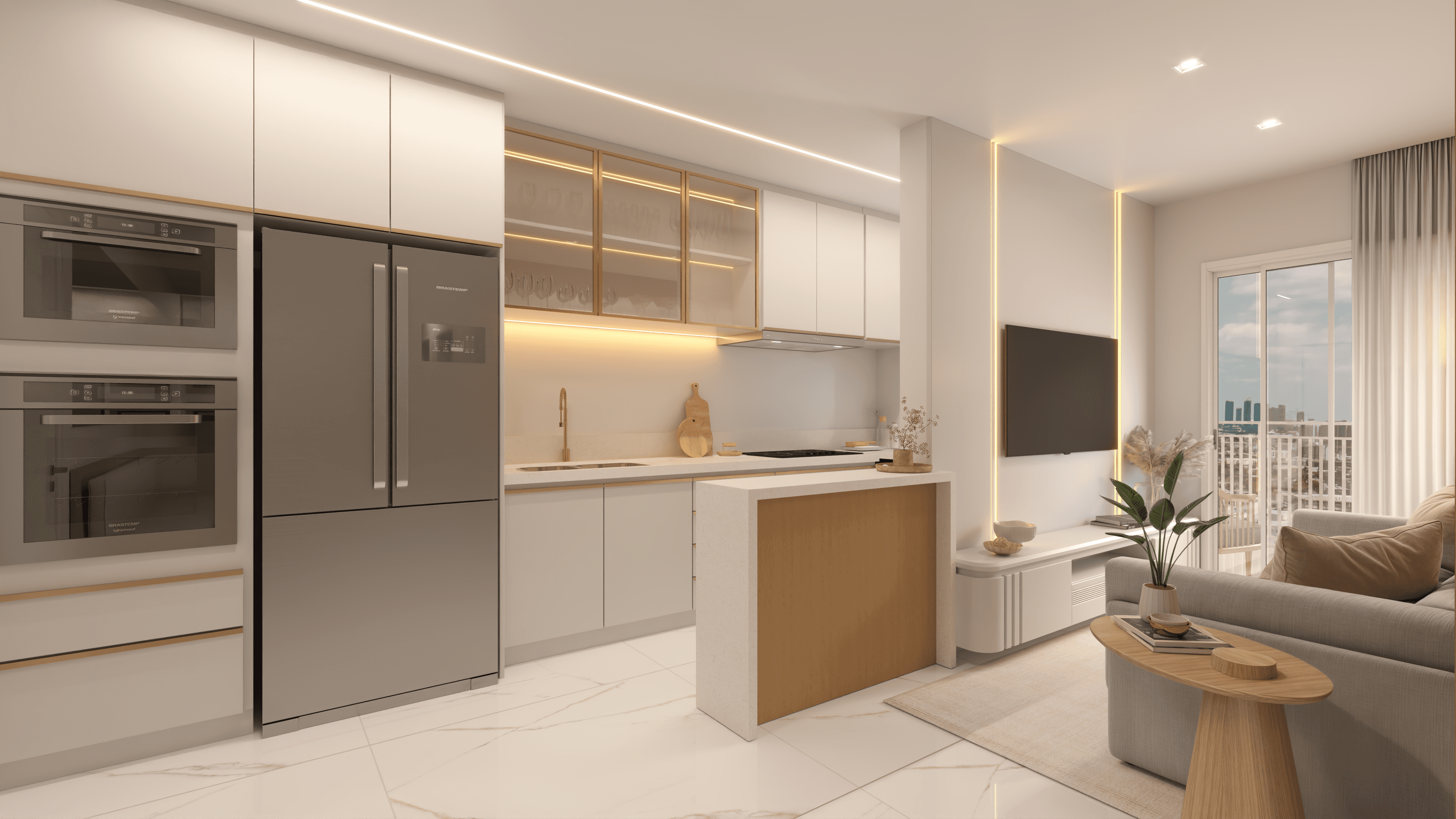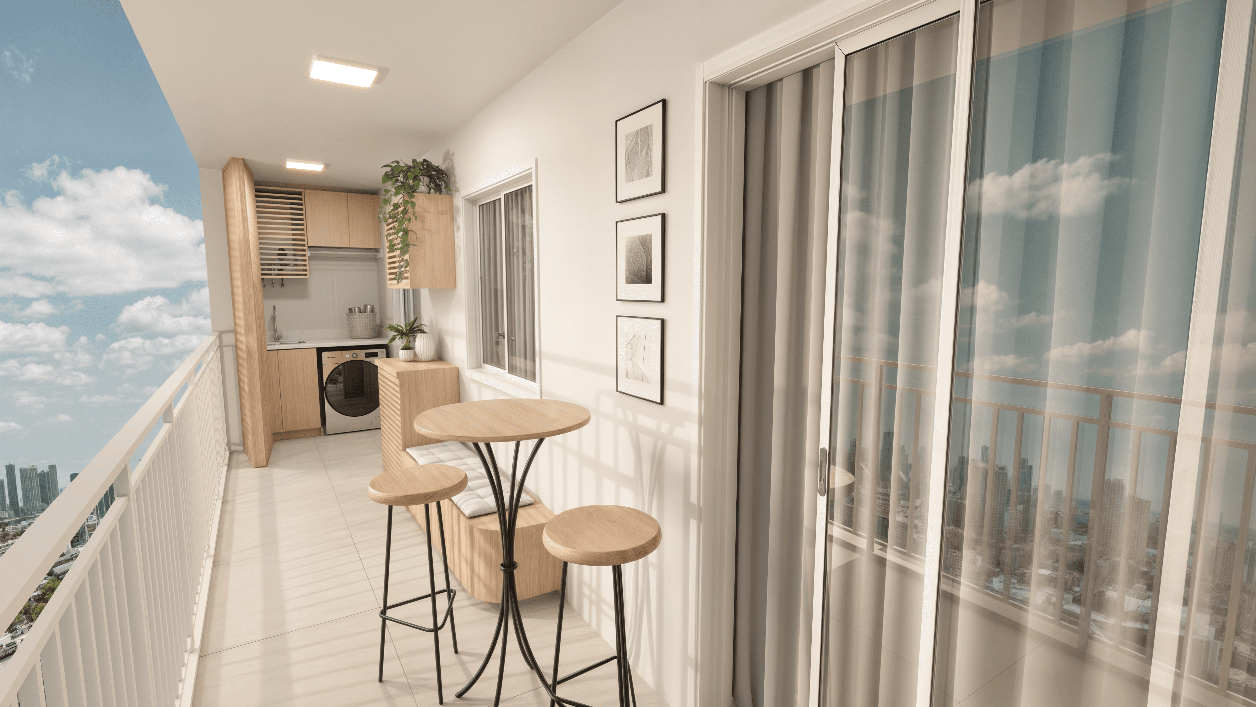 A porta de entrada para o Città Génova. Um layout inteligente sem corredores perdidos, onde a cozinha, o living e a sacada gourmet se conectam para ampliar o convívio.