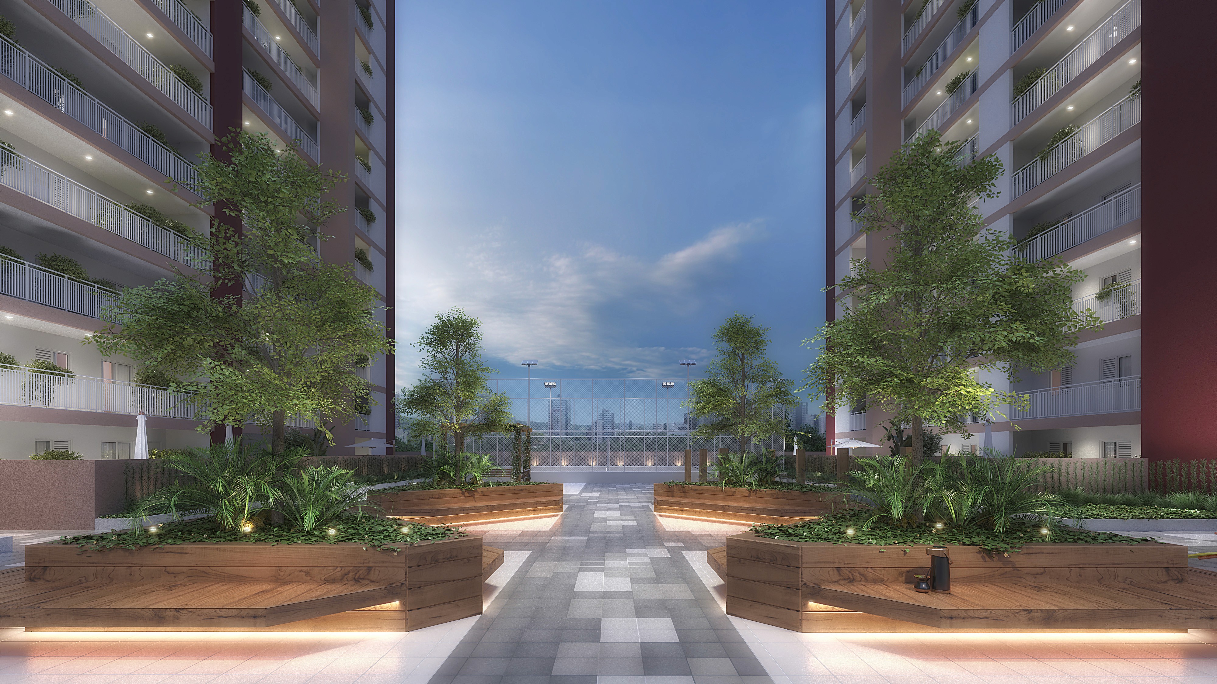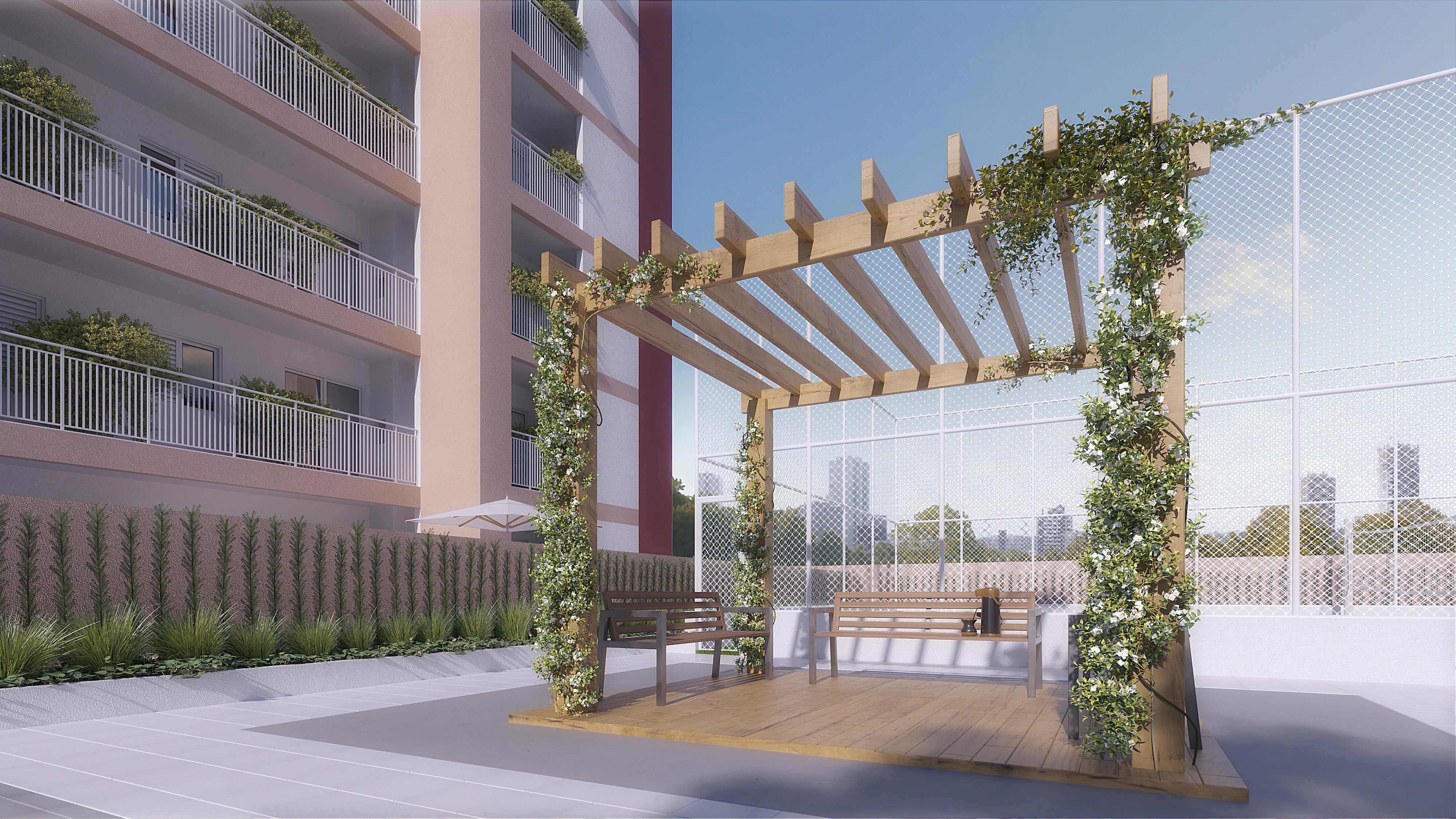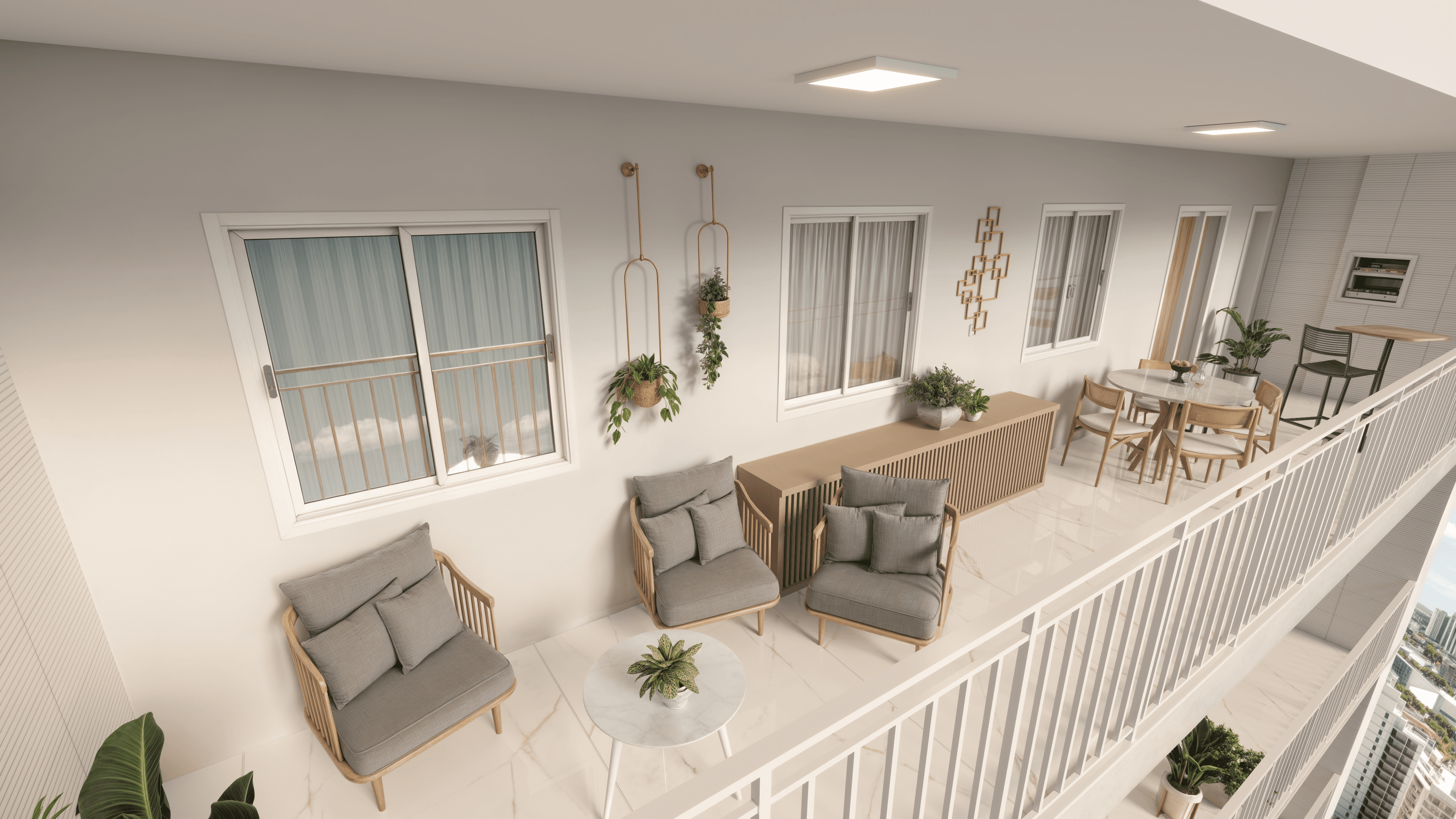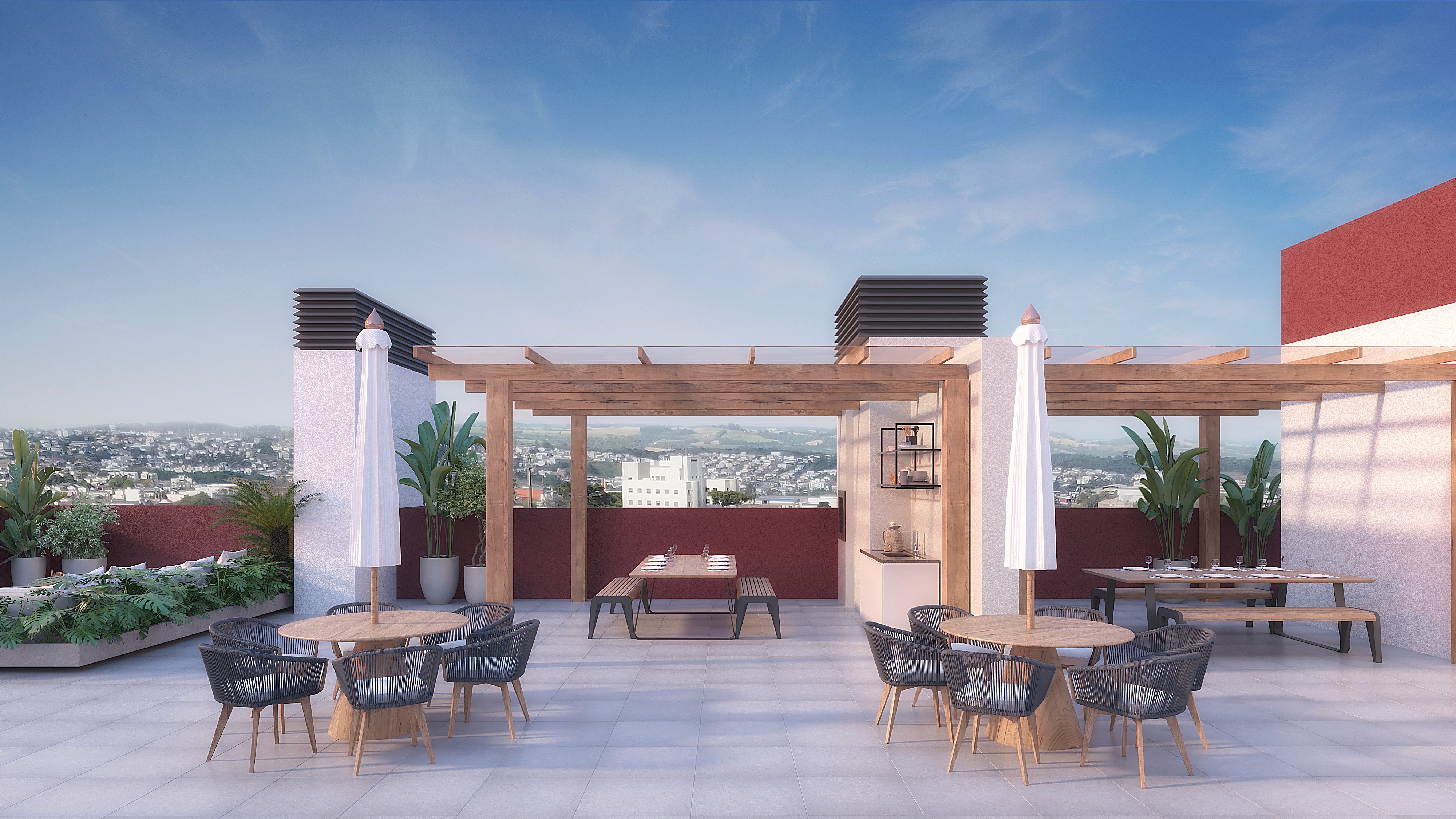 O seu refúgio particular. Com churrasqueira a carvão e integração fluida com o living, é o ambiente perfeito para garantir o churrasco de domingo ou relaxar ao ar livre com a vista privilegiada do Bairro Fátima.