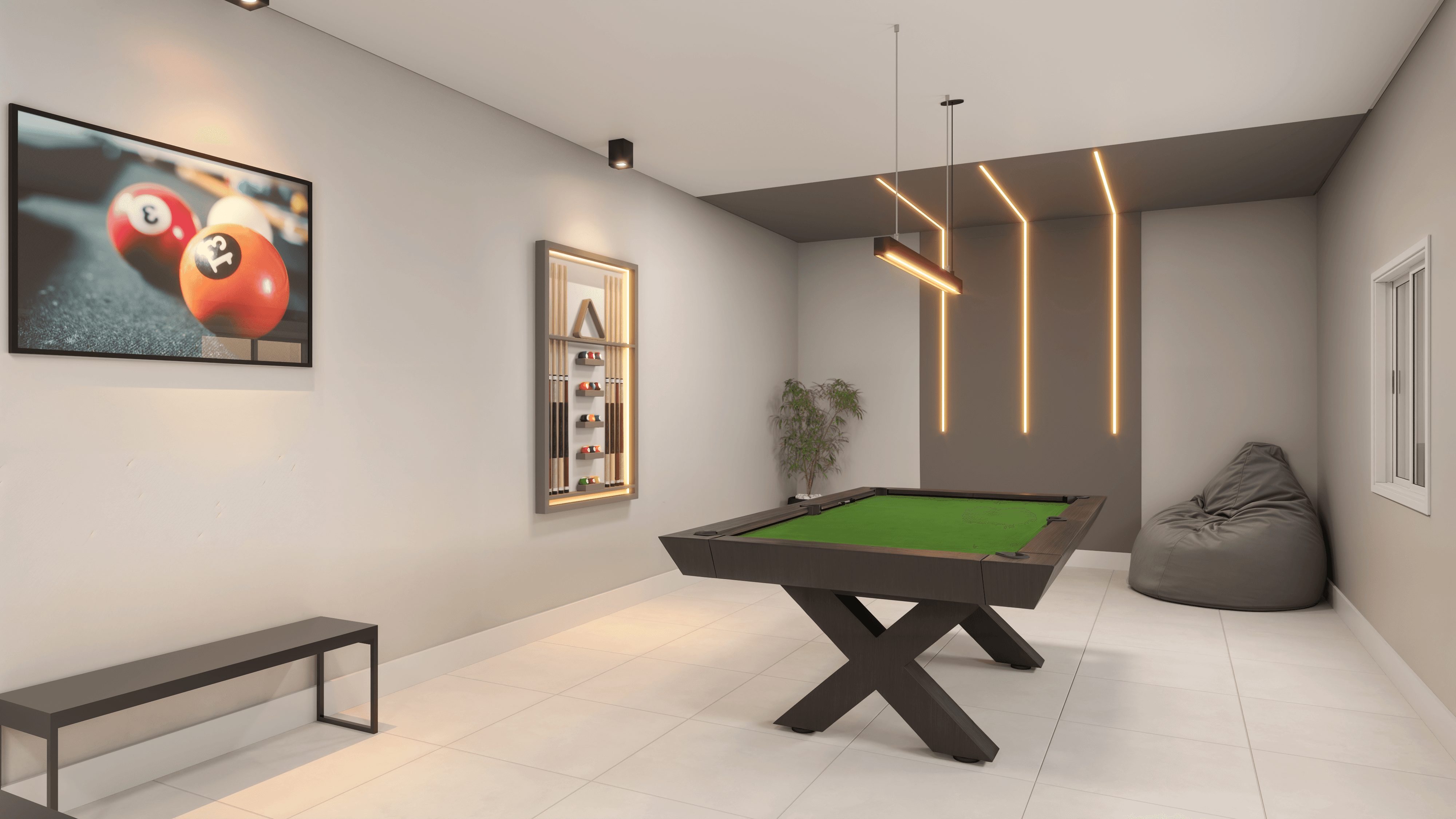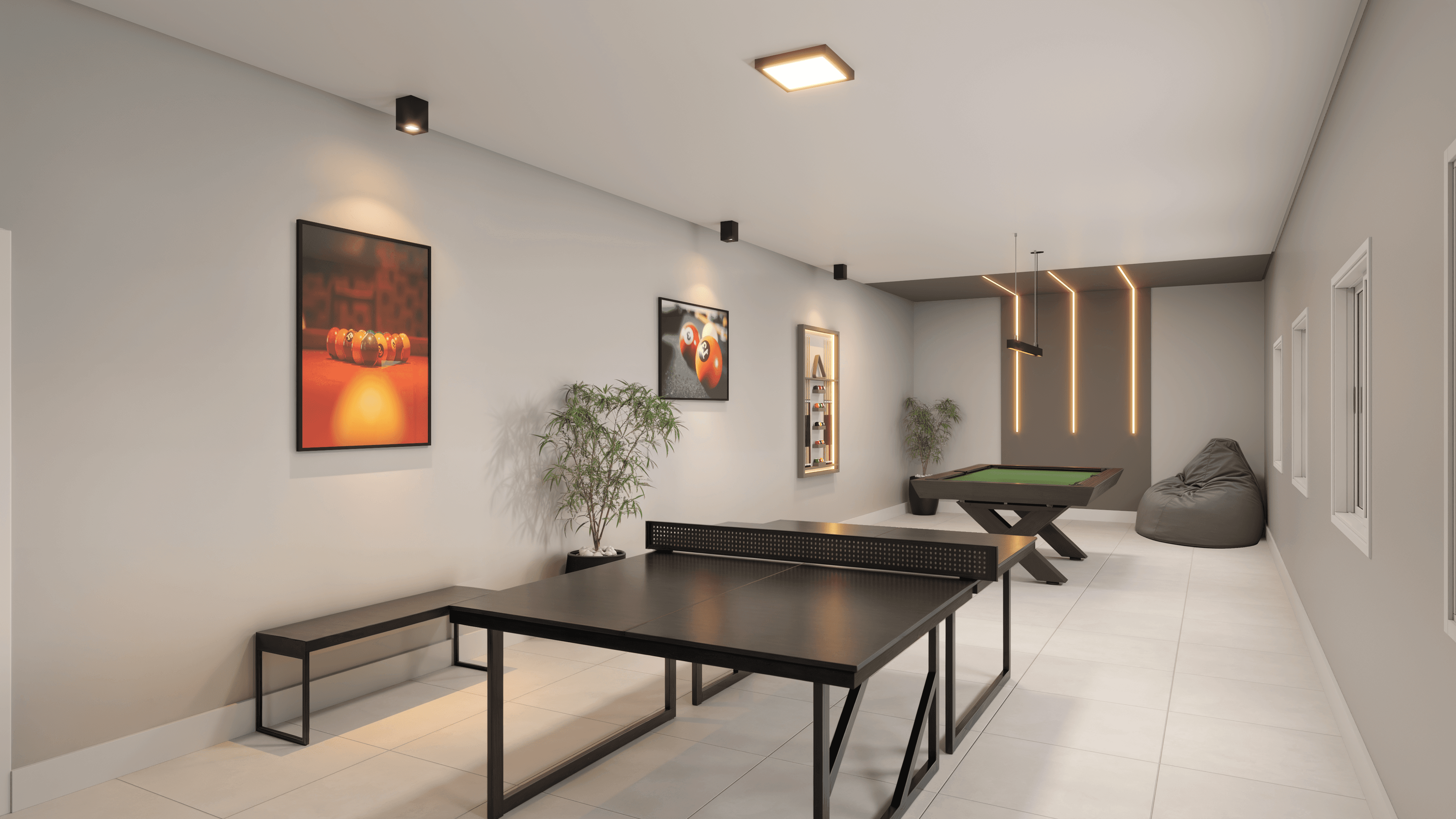 O cenário ideal para suas celebrações. Um ambiente entregue totalmente mobiliado e decorado, que integra a sofisticação de um espaço gourmet com a diversão de uma sala de jogos completa. Perfeito para receber amigos com privacidade e estilo.
